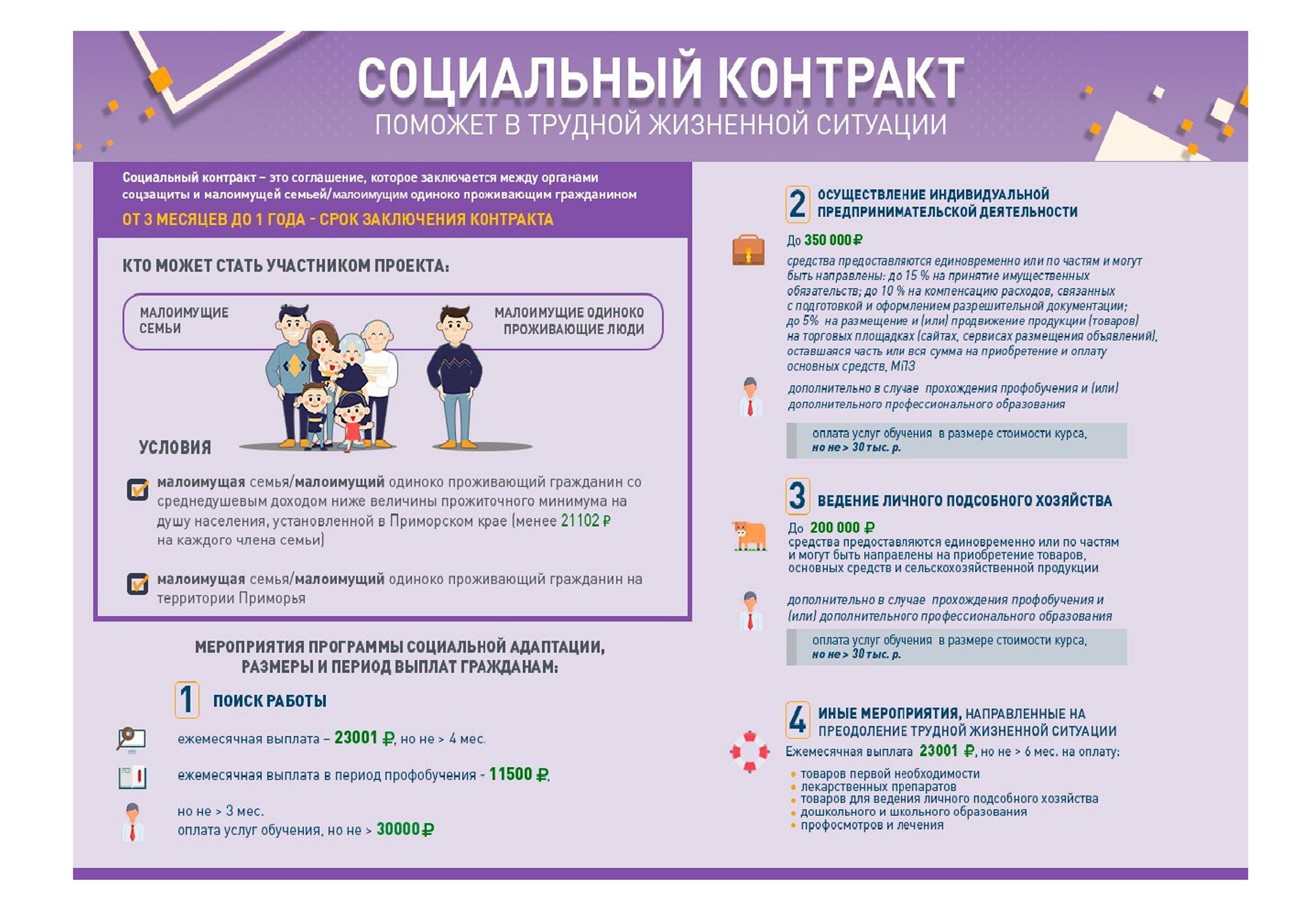 Социальный контракт – это соглашение, которое заключено между гражданином и структурным подразделением КГКУ «Центр социальной поддержки населения Приморского края», в соответствии с которым структурное подразделение КГКУ «Центр социальной поддержки населения Приморского края» обязуется оказать гражданину государственную социальную помощь, а гражданин - реализовать мероприятия, предусмотренные программой социальной адаптации.