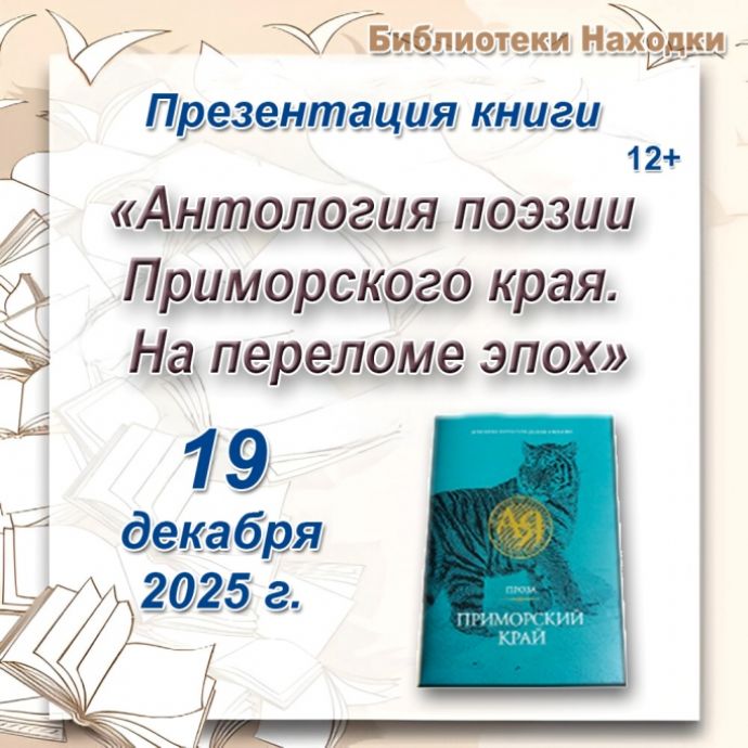 Библиотеки Находки 19 декабря приглашают ценителей литературы на презентацию фундаментального издания «Антология поэзии Приморского края. На переломе эпох». Мероприятие одновременно пройдет на трех площадках города, что позволит максимально широкому кругу горожан познакомиться с этой значимой книгой.