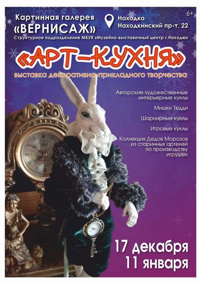 Картинная галерея «Вернисаж» приглашает на открытие выставки декоративно-прикладного искусства «Арт-кухня» 17 декабря, в 16:00. В открытии примут участие пять мастеров из Находки: Маргарита Котлярова, Татьяна Лиханова, Елена Георгиева, Анна Ульянова и Ирина Гриценко - каждый представит своё уникальное направление и творческую историю.