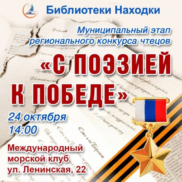 В Находке стартовал приём заявок на муниципальный конкурс чтецов «С поэзией к Победе!», приуроченный к 80-й годовщине Победы в Великой Отечественной войне и Дню героев Отечества. Мероприятие является местным этапом регионального конкурса и проходит в рамках традиционного городского проекта «Звонкий голос дружбы».