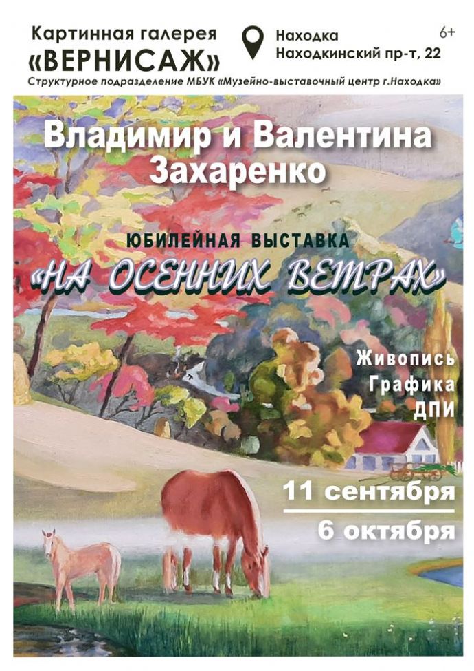 Картинная галерея «Вернисаж» приглашает на открытие юбилейной выставки Владимира и Валентины Захаренко «На осенних ветрах», которое состоится 11 сентября, в 16:00. Экспозиция приурочена к 80-летию Владимира Кирилловича и 75-летию Валентины Васильевны, членов Находкинского отделения Союза художников России.