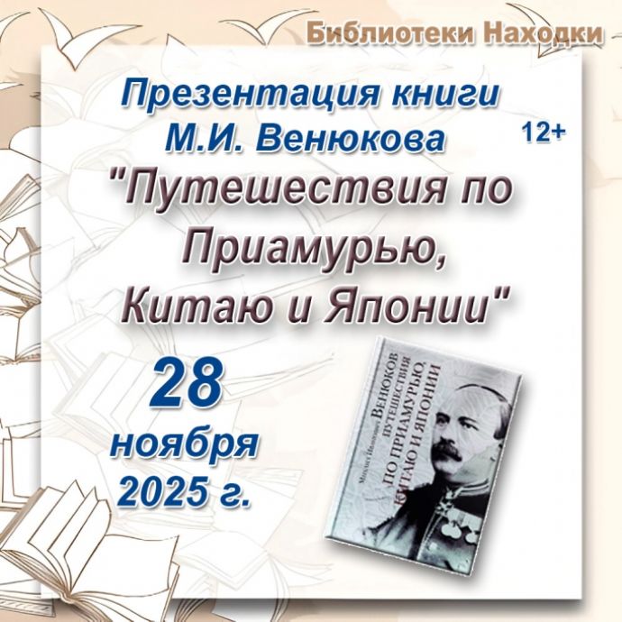 Библиотеки Находки 28 ноября приглашают жителей города на презентацию уникальной книги исследований и открытий «Путешествия по Приамурью, Китаю и Японии», посвященной наследию выдающегося исследователя Дальнего Востока Михаила Венюкова. Мероприятие пройдет одновременно в четырех библиотеках города в разное время, что позволит каждому желающему выбрать удобную площадку и лично познакомиться с наследием российского путешественника.