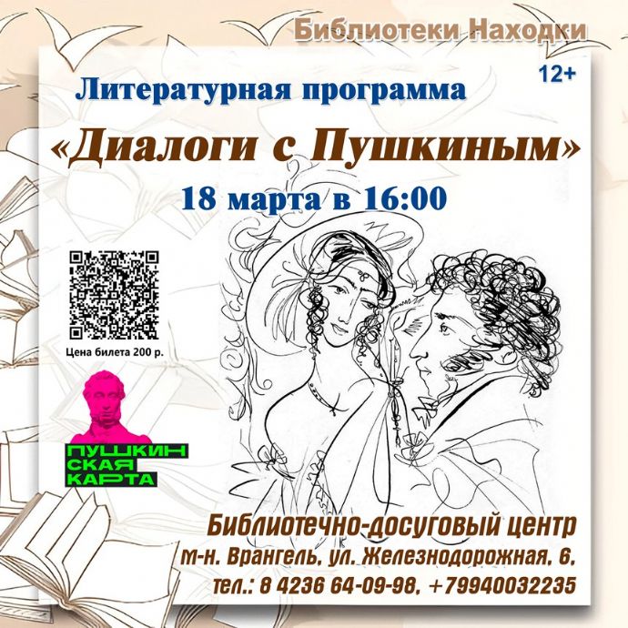 Библиотечно-досуговый центр приглашает на литературную программу «Диалоги с Пушкиным», посвященную роману «Капитанская дочка». Мероприятие состоится 18 марта в 16:00 по адресу: мкр. Врангель, ул. Железнодорожная, 6.