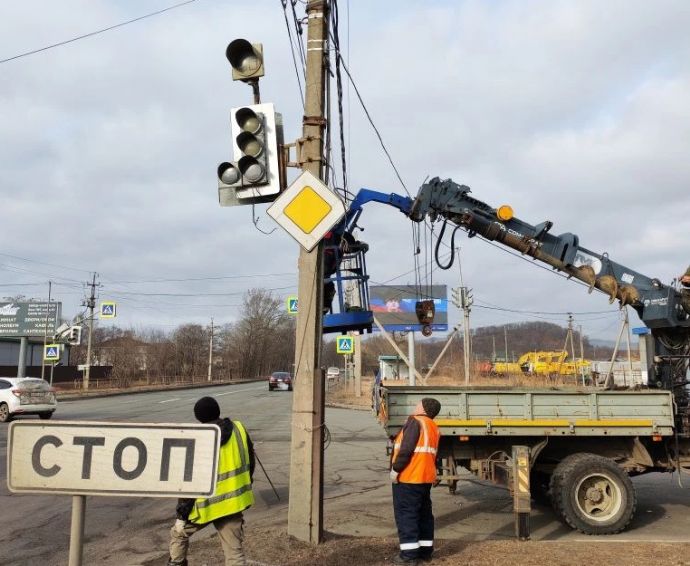 В Находке проводятся работы по модернизации светофорного объекта на пересечении улицы Шоссейной в районе базы ТМТ. В рамках плановых мероприятий по повышению безопасности дорожного движения специалисты демонтируют старое оборудование. На его место установят новый светофор, корпус которого имеет больший диаметр (вместо 200 мм устанавливают 300 мм), чем предшественник.