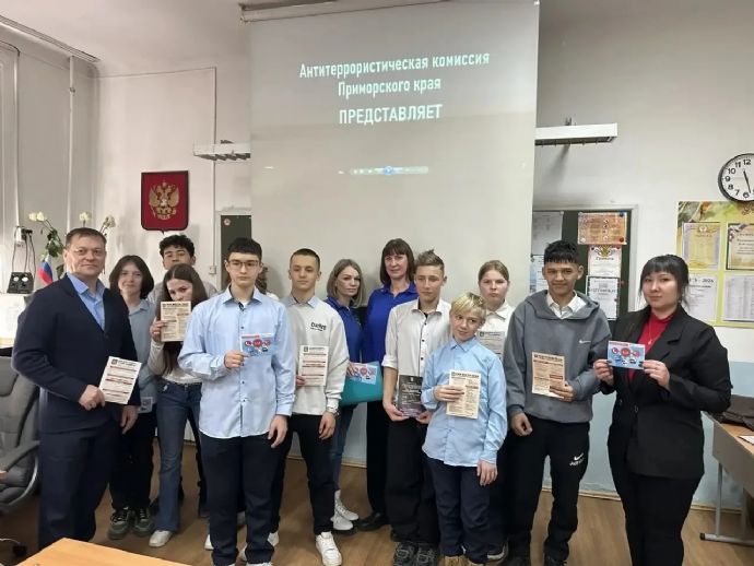 Начальник отдела по антитеррористической защищенности Денис Каргаполов обсудил с учениками тему вербовки несовершеннолетних через современные технологии и социальные сети. Ученикам показали созданный Антитеррористической комиссией Приморского края видеоролик о методах вовлечения молодёжи в противоправную деятельность через интернет.