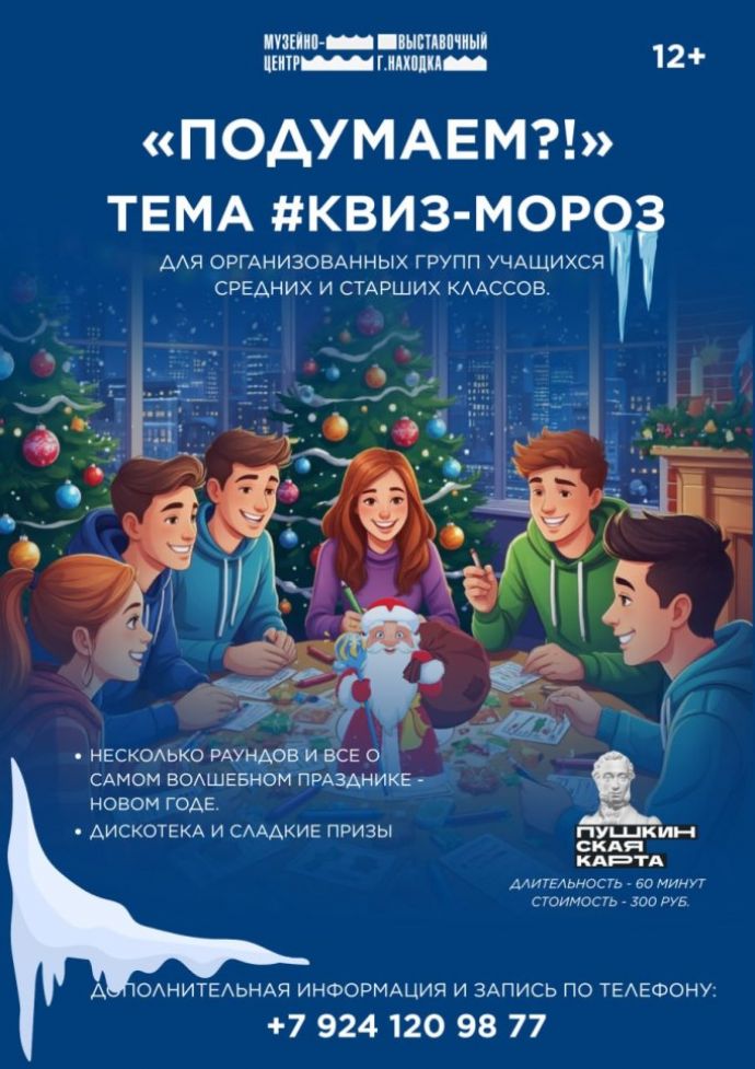 Музейно-выставочный центр Находки (ул. Владивостокская, 6) приглашает школьников средних и старших классов на новогодний интеллектуальный квиз «Подумаем?!».