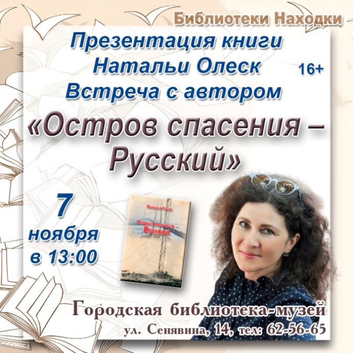 Библиотеки Находки приглашают на презентацию книги Натальи Олеск «Остров спасения – Русский», которая состоится 7 ноября.