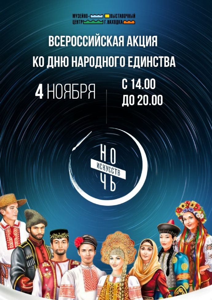 Музейно-выставочный центр Находки приглашает 4 ноября жителей и гостей города принять участие во Всероссийской акции «Ночь искусств», приуроченной ко Дню народного единства. Мероприятия пройдут одновременно на трёх площадках, с 14:00 до 20:00.