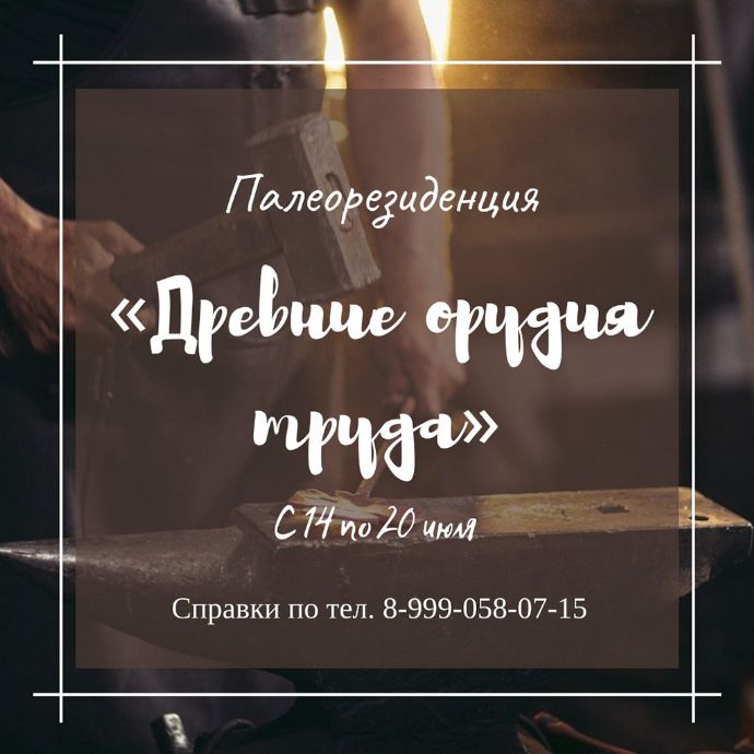 с 14 по 20 июля в комплексе «Палеодеревня» будет проходить палеорезиденция «Древние орудия труда». Под руководством мастера кузнечного дела, руководителя музея-мастерской народных ремёсел «Жар-птица», обладателя званий «Лидер туриндустрии Приморья» и «Лидеры турбизнеса города Находка» Максима Христенко вас ждет: