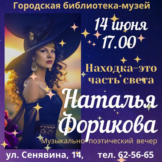 14 июня в 17.00 Городская библиотека-музей приглашает на музыкально-поэтический вечер приморской поэтессы Натальи Фориковой «Находка - это часть света» На встрече автор, журналист, телеведущая, режиссёр, актриса, педагог, руководитель театральной студии, творческого объединения «Театр поэзии жизни», член Приморского отделения Российского Союза писателей Наталья Форикова представит свою новую книгу «А в море падала звезда».