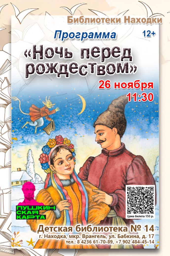26 ноября в 11:30 Детская библиотека №14 (микрорайон Врангель, ул. Бабкина, д. 17) приглашает подростков и молодежь на увлекательную программу «Ночь перед Рождеством», созданную по мотивам одноименной повести Николая Гоголя. Мероприятие рассчитано на участников старше 12 лет.