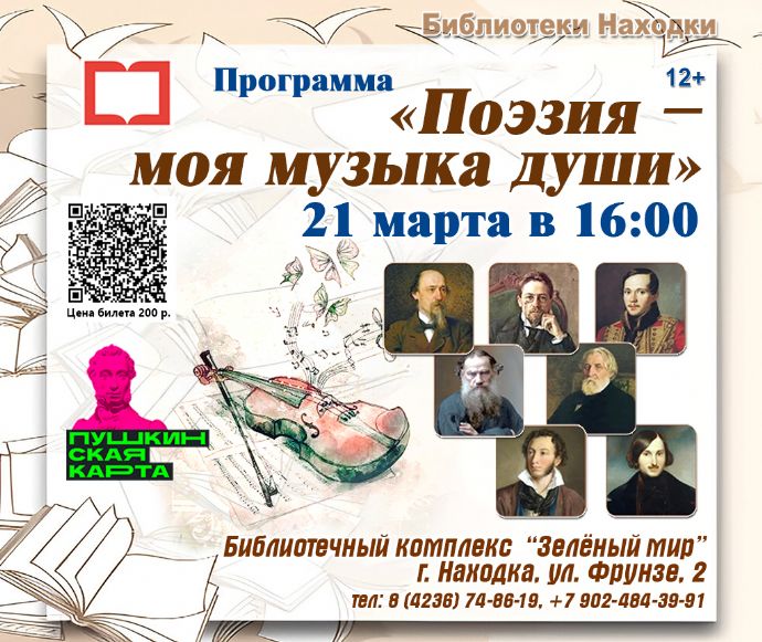 Библиотечный комплекс «Зеленый мир» (ул. Фрунзе, 2) 21 марта приглашает жителей и гостей Находки на программу «Поэзия – моя музыка души». Мероприятие посвящено Всемирному дню поэзии, начало в 16 часов.