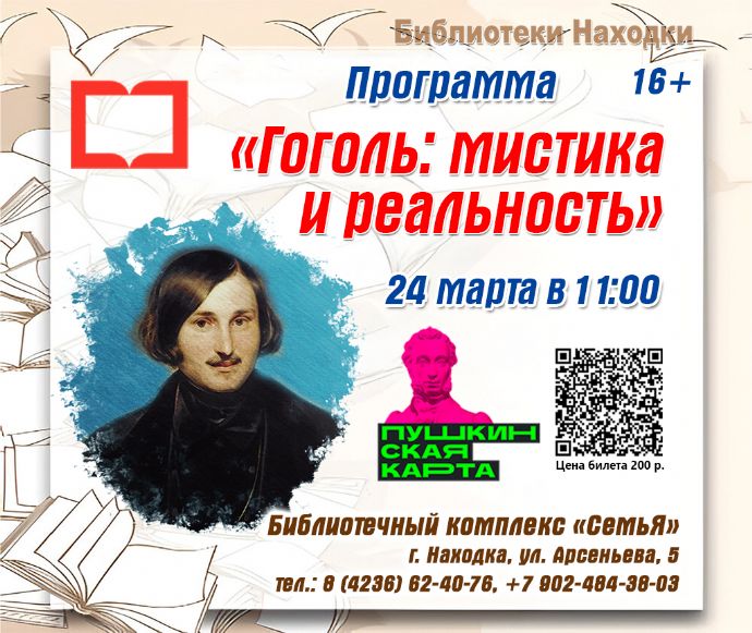 Библиотечный комплекс «СемьЯ» (Арсеньева, 5) приглашает жителей и гостей Находки на литературную игру «Гоголь: мистика и реальность». Мероприятие состоится 24 марта. Начало в 11:00. Дополнительный сеанс - в 13:00.