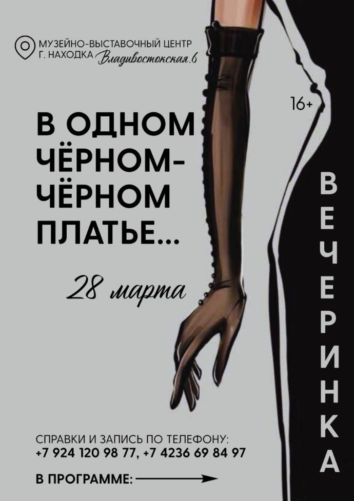Музейно-выставочный центр Находки (ул. Владивостокская, 6) 28 марта приглашает женщин на вечеринку, посвящённую культовому предмету гардероба — маленькому чёрному платью. Мероприятие под названием «Мне нечего надеть!» объединит эстетику, творчество и светское общение.
