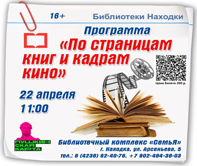 В библиотечном комплексе «СемьЯ» (ул. Арсеньева, 5) 22 апреля пройдет интерактивная программа «По страницам книг и кадрам кино» для посетителей старше 16 лет. Начало в 11:00.