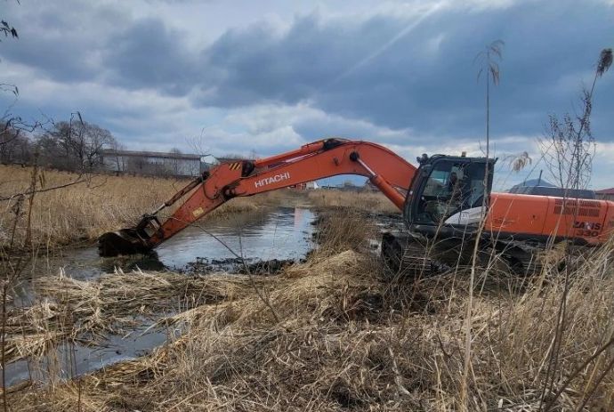 Сейчас экскаватор занимается чисткой и углублением русла. Протяжённость расчистки составляет 2300 погонных метров.