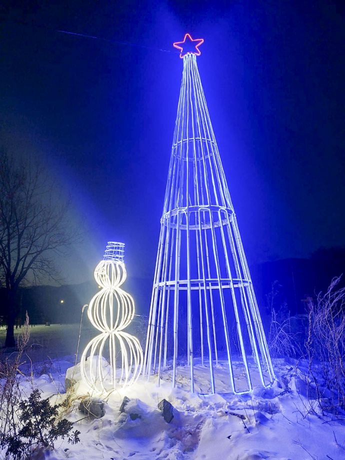 Металлическая ёлка и снеговик, подсвеченные электрогирляндой, будут установлены сразу на трех площадках населённого пункта: в сквере посёлка Первостроителей, на перекрёстке во Врангеле (площадка возле рынка) и пешеходная зона в поселке МПС.
