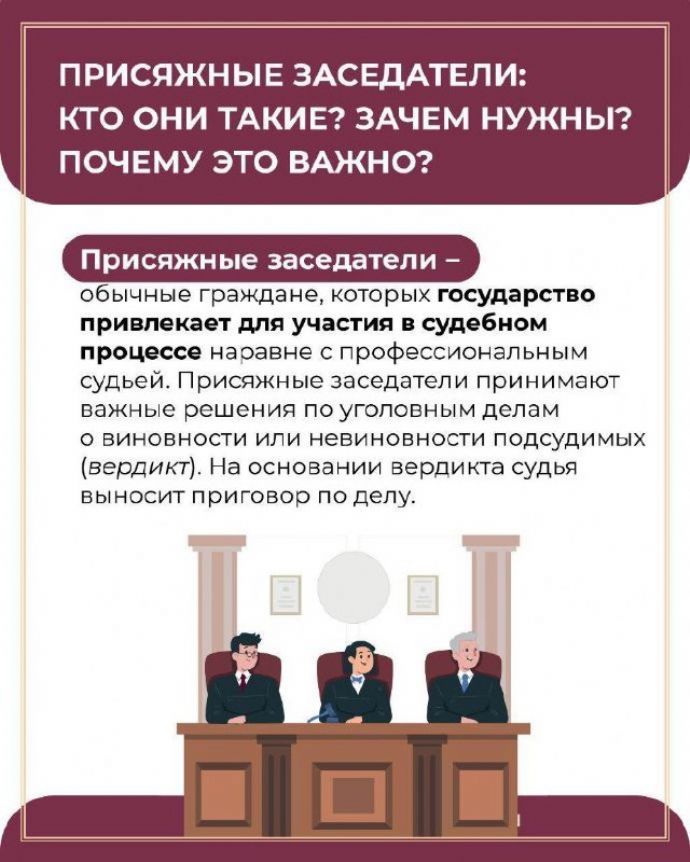 Присяжные заседатели - неотъемлемый элемент правовой системы государства. Благодаря этому у обычных граждан имеется возможность принимать участие в рассмотрении судами уголовных дел. Если вам пришло уведомление поучаствовать в судебном заседании в качестве присяжного - не упускайте такую возможность! Не исключено, что именно ваше независимое мнение станет решающим аргументом при вынесении судьей решения по уголовному делу.