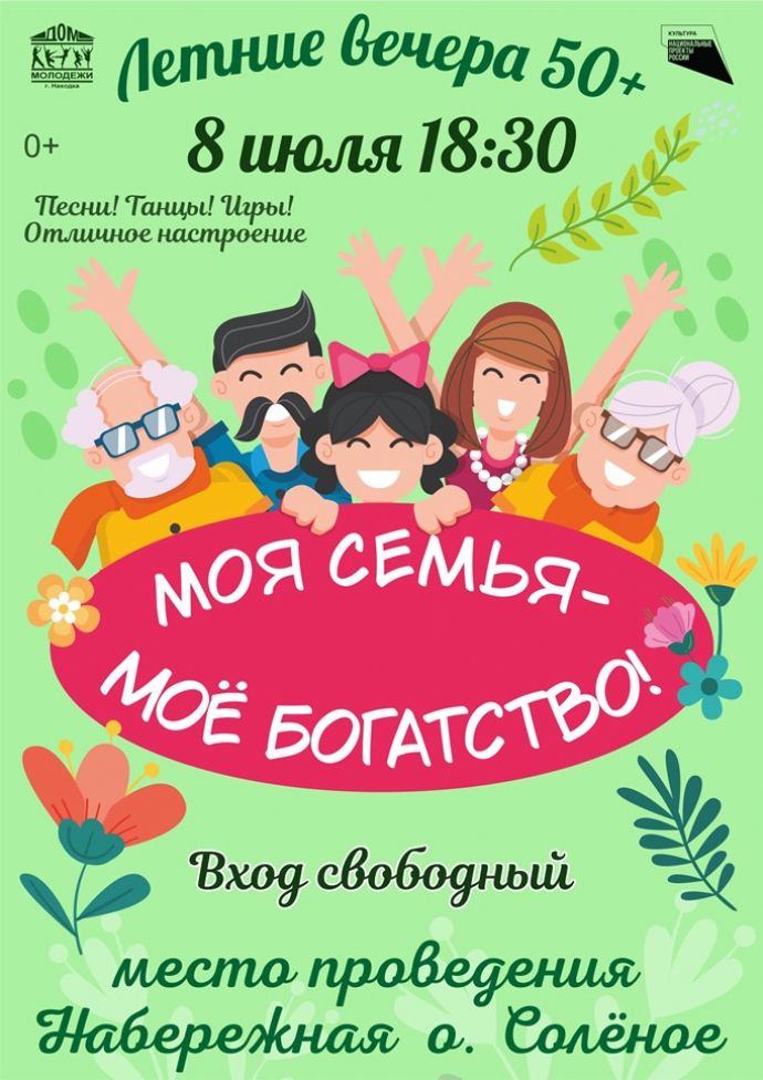 08.07. Летние вечера 50+: Моя семья – моё богатство, набережная о. Солёное, 18:30, вход свободный.